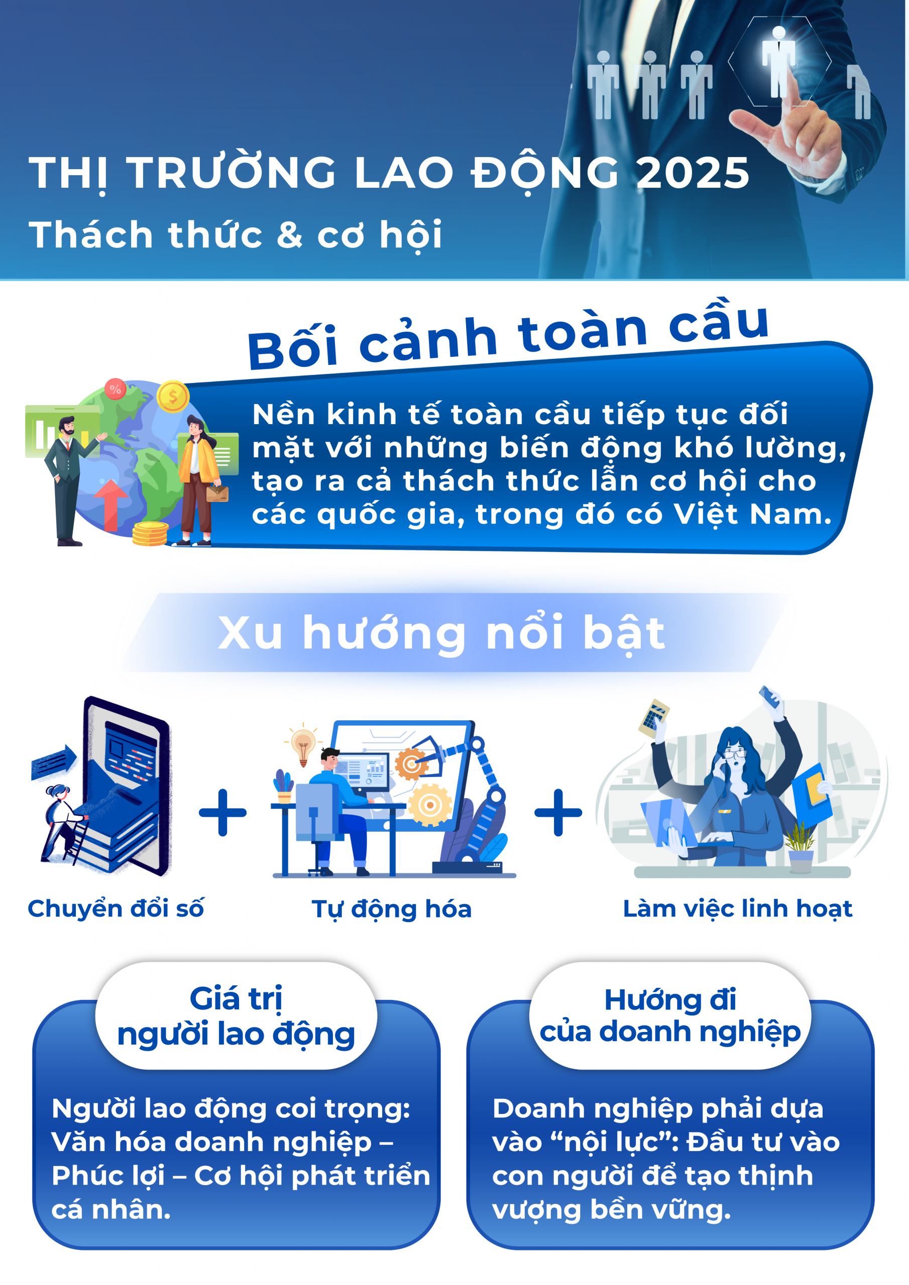 Năm 2025, nền kinh tế toàn cầu tiếp tục đối mặt với những biến động khó lường, tạo ra cả thách thức lẫn cơ hội cho các quốc gia, trong đó có Việt Nam. Các xu hướng như chuyển đổi số, tự động hóa và mô hình làm việc linh hoạt (remote/hybrid) đang định hình lại thị trường lao động. Doanh nghiệp dần phải thích nghi để thu hút và giữ chân nhân tài trong bối cảnh “cuộc chiến nhân lực” ngày càng gay gắt. Người lao động hiện nay coi trọng văn hóa doanh nghiệp, phúc lợi và sự phát triển cá nhân hơn bao giờ hết.
