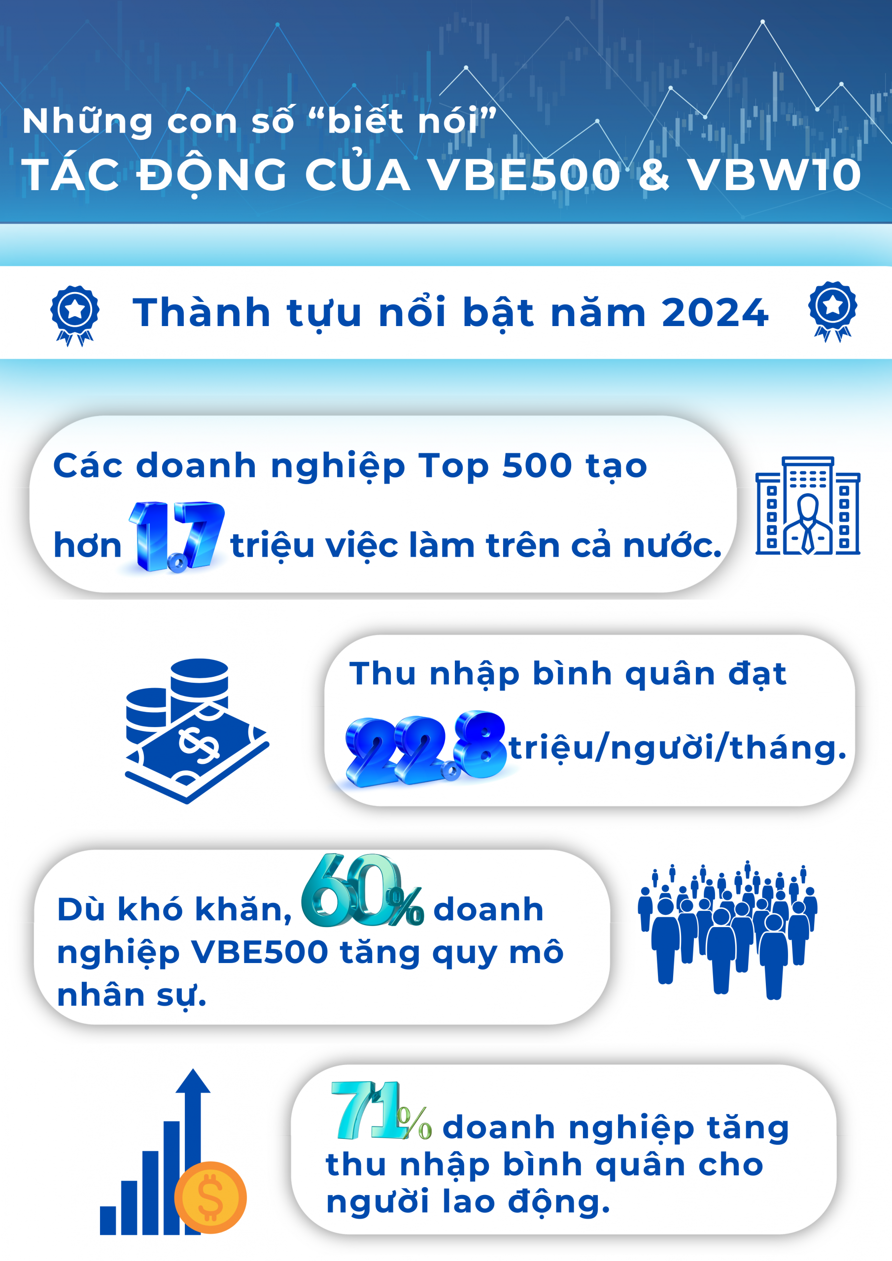 Qua 3 năm triển khai, VBE500 và VBW10 đã cho thấy tầm ảnh hưởng đáng kể. Chỉ riêng năm 2024, các doanh nghiệp trong Top 500 đã tạo việc làm cho hơn 1,7 triệu lao động trên khắp cả nước, với thu nhập bình quân đạt gần 22,8 triệu đồng/người/tháng. Thậm chí trong bối cảnh kinh tế khó khăn, 60% doanh nghiệp thuộc VBE500 vẫn tăng quy mô nhân sự so với năm trước, và 71% doanh nghiệp ghi nhận mức tăng thu nhập bình quân của người lao động.