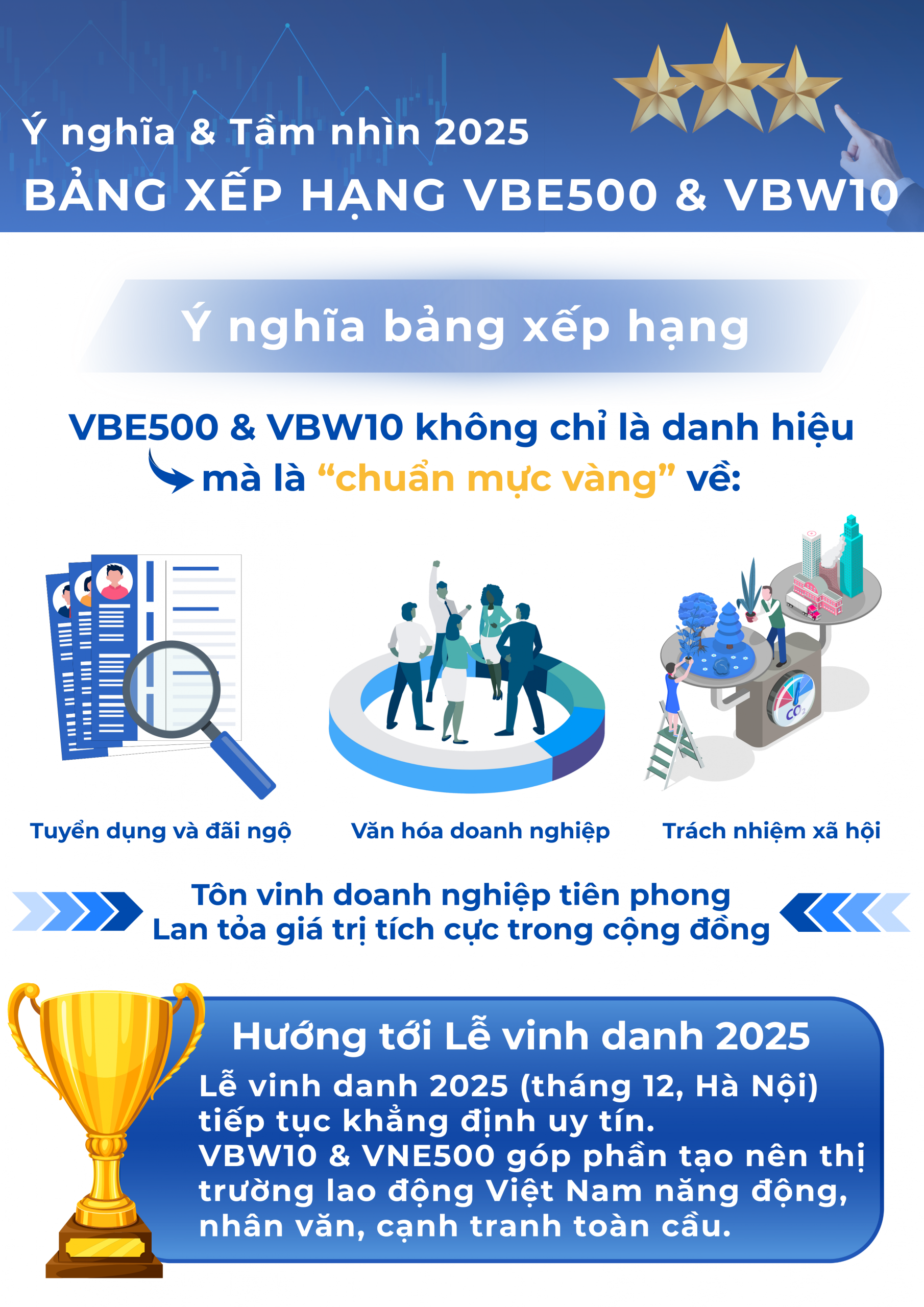 Chương trình nghiên cứu và xếp hạng thường niên Top 500 Nhà tuyển dụng hàng đầu Việt Nam (VBE500) và Top 10 Nơi làm việc tốt nhất Việt Nam (VBW10) ra đời từ năm 2022 do Viet Research phối hợp với Báo Tài chính Đầu tư ghi nhận và tôn vinh những doanh nghiệp có thành tích xuất sắc trong tạo việc làm, đãi ngộ người lao động và đạt kết quả kinh doanh tốt, bền vững. Thông qua việc thiết lập các tiêu chuẩn cao về môi trường làm việc, văn hóa doanh nghiệp và phúc lợi, các doanh nghiệp được vinh danh đã trở thành những “chuẩn mực vàng” trong cộng đồng doanh nghiệp. Việc tôn vinh này cũng thúc đẩy trách nhiệm xã hội của doanh nghiệp, khuyến khích phát triển bền vững bằng cách không chỉ tập trung vào lợi nhuận mà còn quan tâm đến yếu tố con người, môi trường và cộng đồng. Những nhà tuyển dụng hàng đầu không chỉ xây dựng thương hiệu vững mạnh cho riêng mình mà còn góp phần làm cho Việt Nam trở thành một thị trường lao động hấp dẫn và cạnh tranh hơn trên bình diện quốc tế.