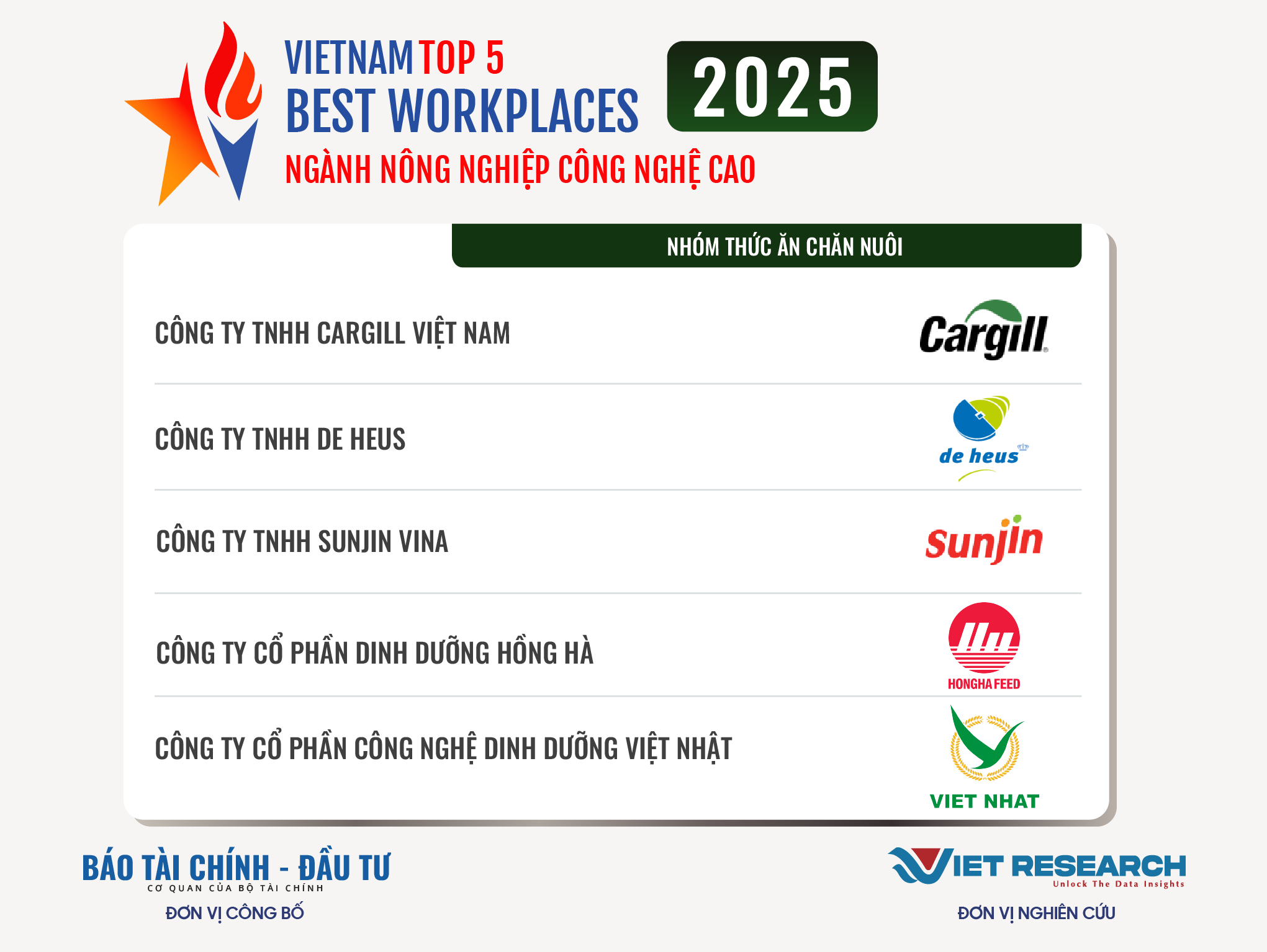 Năm 2025 là năm thứ tư liên tiếp Chương trình Top 10 Nơi làm việc tốt nhất Việt Nam – VBW10 trong các ngành kinh tế trọng điểm được Viet Research và Báo Tài chính – Đầu tư (Bộ Tài chính) nghiên cứu và công bố. Đây là chương trình thường niên nhằm tìm kiếm và tôn vinh những doanh nghiệp có môi trường làm việc tốt nhất trong các ngành, các doanh nghiệp tuyển dụng hàng đầu Việt Nam, những thành tố quan trọng tạo cơ hội việc làm, góp phần chung vào sự phát triển bền vững của đất nước và nền kinh tế trong giai đoạn mới. Những doanh nghiệp xuất sắc góp mặt trong VBW10 đóng vai trò quan trọng trong việc định hình và nâng cao chất lượng thị trường lao động quốc gia, đóng vai trò dẫn dắt trong việc thúc đẩy trách nhiệm xã hội và phát triển bền vững, tạo ra giá trị lâu dài cho các cổ đông, người lao động, nền kinh tế và xã hội.