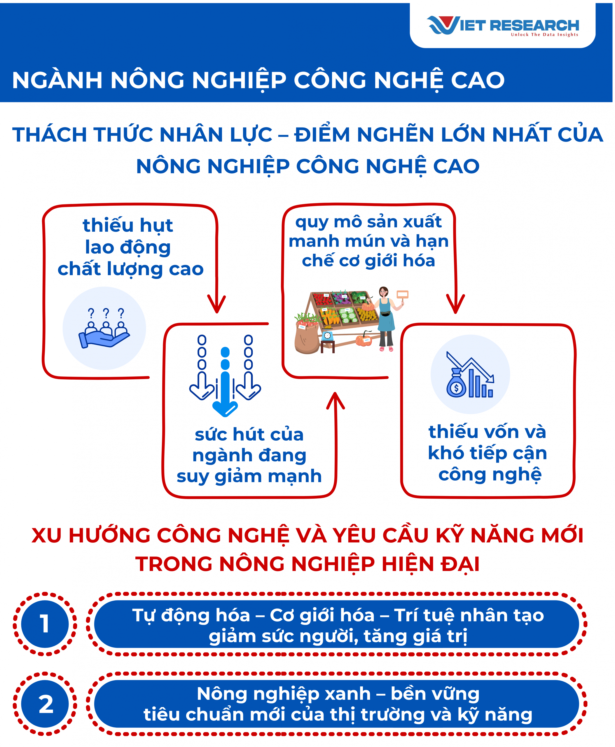 Sự phát triển nhanh của công nghệ trong nông nghiệp đang làm lộ rõ những rào cản sâu sắc về nhân lực – từ quy mô, chất lượng đến kỹ năng và khả năng thích ứng. Dù nông nghiệp công nghệ cao đang mở ra cơ hội tăng năng suất và thu nhập, song nguồn lao động hiện nay vẫn “vừa thiếu, vừa yếu”, chưa theo kịp tốc độ chuyển đổi của ngành. Nghiên cứu và khảo sát của Viet Research đối với các doanh nghiệp trong Danh sách Top 10 Nơi làm việc tốt nhất Việt Nam – Ngành Nông nghiệp công nghệ cao chỉ ra 4 nhóm thách thức nổi bật đang kìm hãm sự phát triển của nguồn nhân lực trong lĩnh vực này.