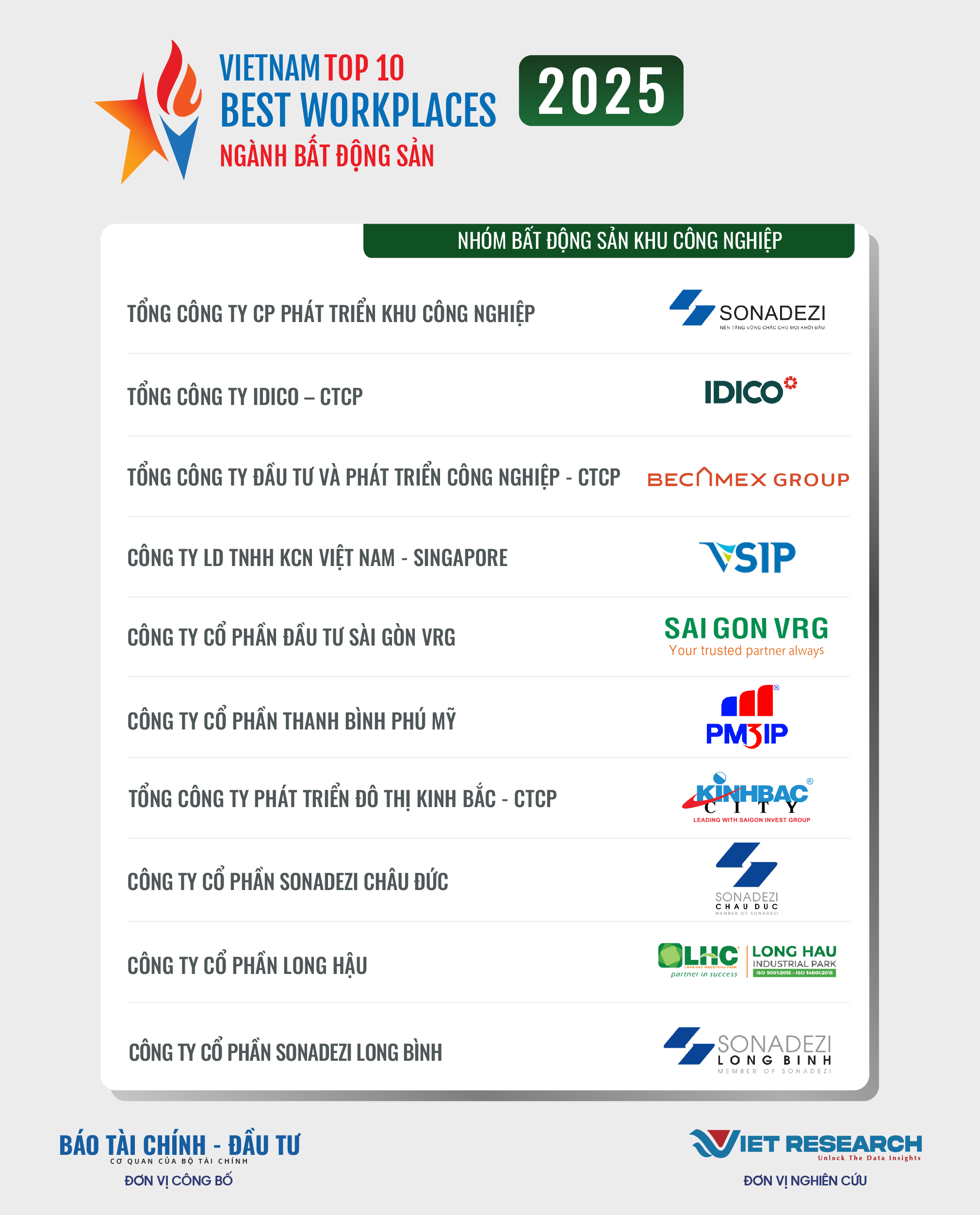 Năm 2025 là năm thứ tư liên tiếp Chương trình Top 10 Nơi làm việc tốt nhất Việt Nam – VBW10 trong các ngành kinh tế trọng điểm được Viet Research và Báo Tài chính – Đầu tư (Bộ Tài chính) nghiên cứu và công bố. Đây là chương trình thường niên nhằm tìm kiếm và tôn vinh những doanh nghiệp có môi trường làm việc tốt nhất trong các ngành, các doanh nghiệp tuyển dụng hàng đầu Việt Nam, những thành tố quan trọng tạo cơ hội việc làm, góp phần chung vào sự phát triển bền vững của đất nước và nền kinh tế trong giai đoạn mới. Những doanh nghiệp xuất sắc góp mặt trong VBW10 đóng vai trò quan trọng trong việc định hình và nâng cao chất lượng thị trường lao động quốc gia, đóng vai trò dẫn dắt trong việc thúc đẩy trách nhiệm xã hội và phát triển bền vững, tạo ra giá trị lâu dài cho các cổ đông, người lao động, nền kinh tế và xã hội.