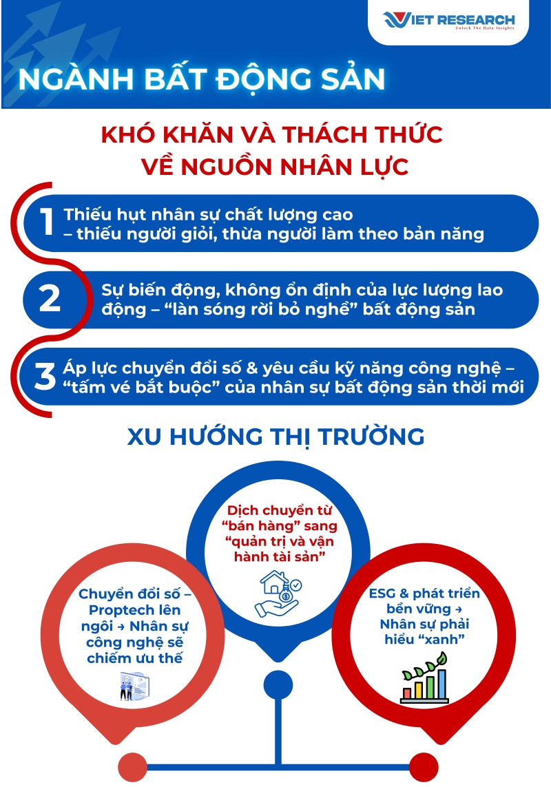 Nguồn nhân lực đang trở thành nút thắt cổ chai của thị trường bất động sản Việt Nam. Theo Hiệp hội Bất động sản Việt Nam (VNREA), lực lượng lao động hiện tại chỉ đáp ứng khoảng 30 – 40% nhu cầu của doanh nghiệp. Nghĩa là cứ 10 vị trí cần tuyển thì có đến 6 – 7 vị trí không tìm được người phù hợp.