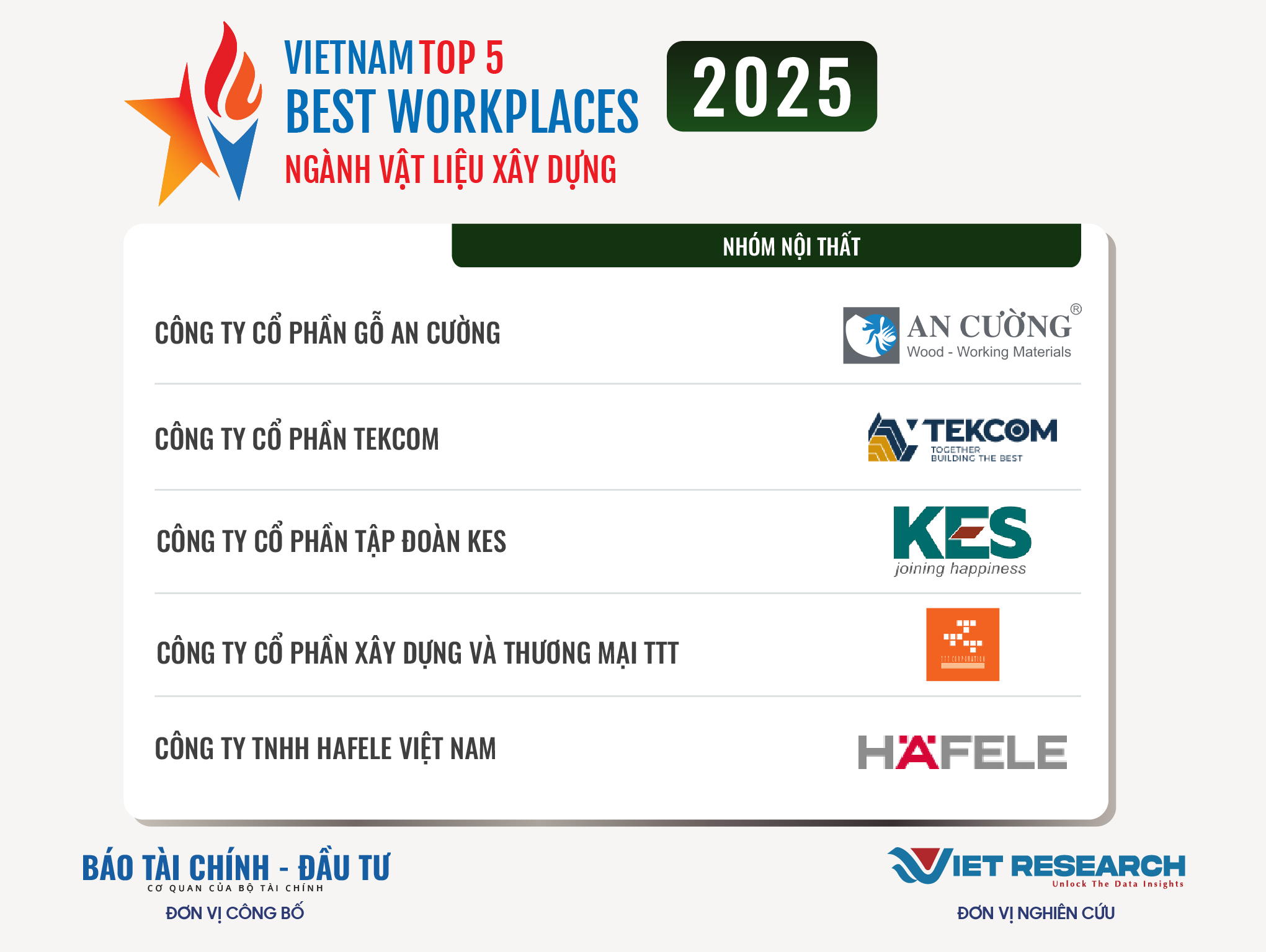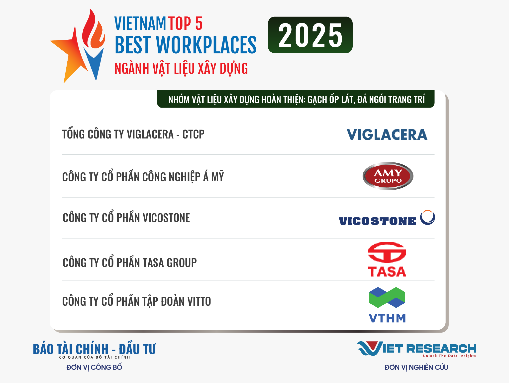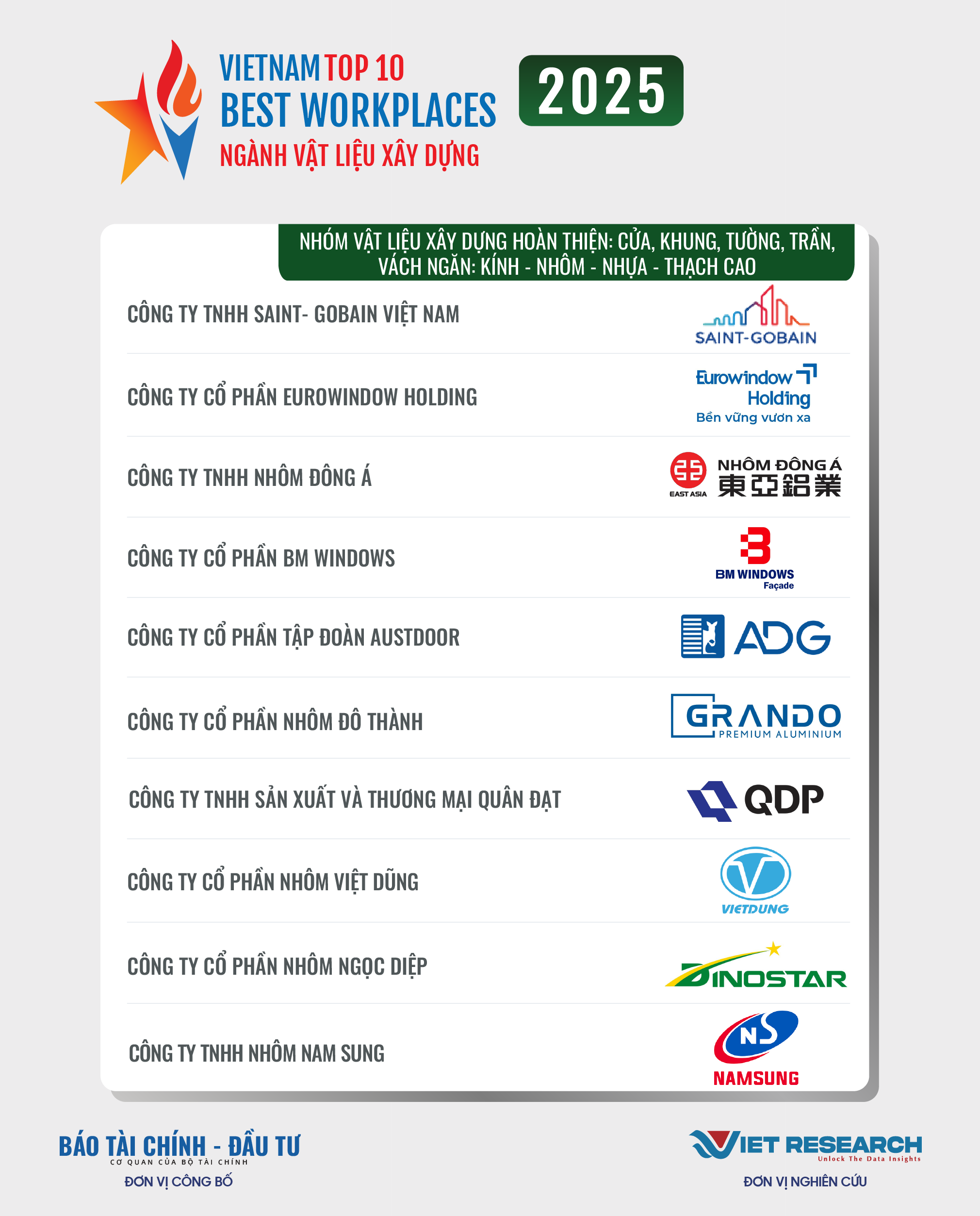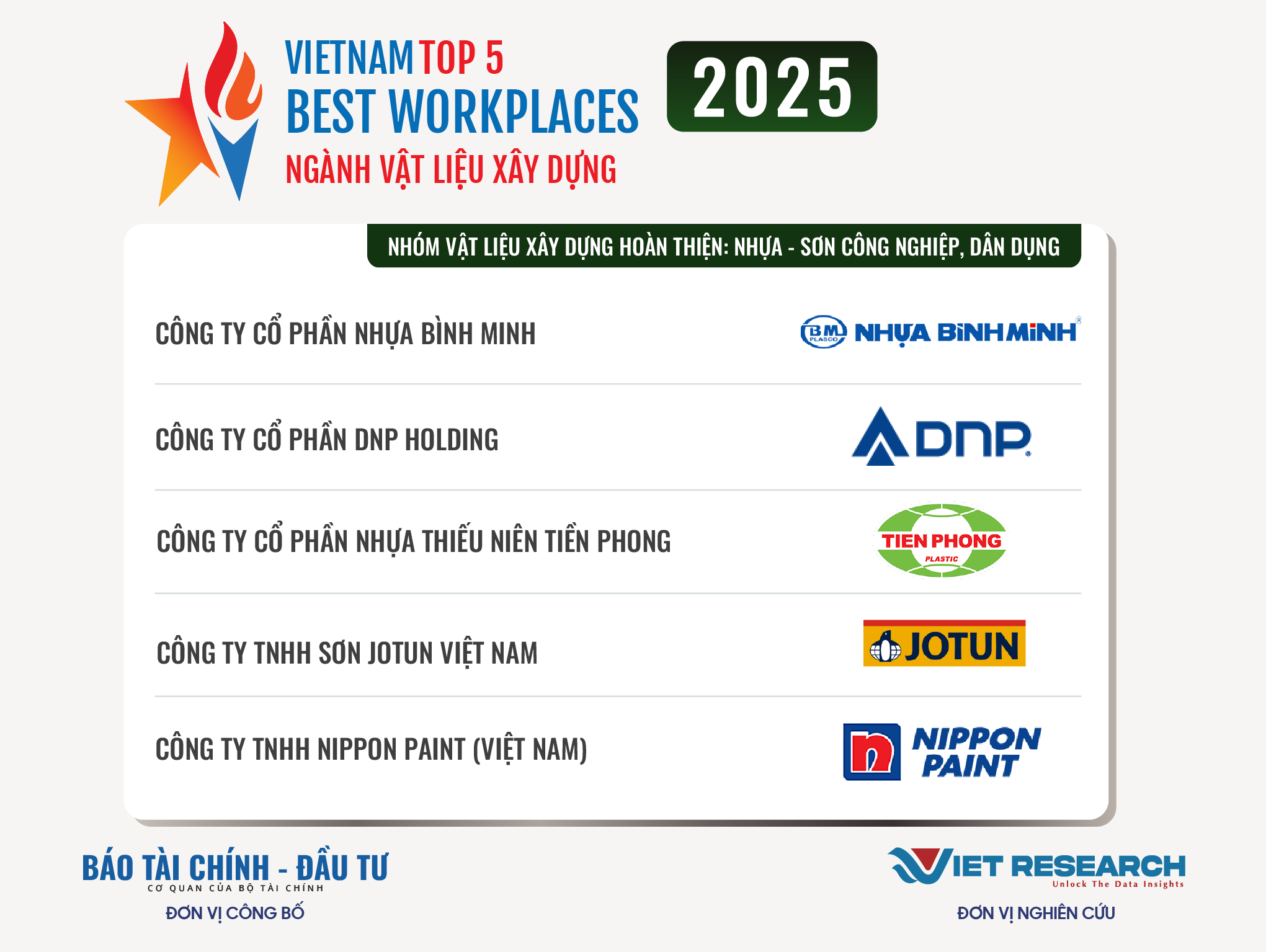 Năm 2025 là năm thứ tư liên tiếp Chương trình Top 10 Nơi làm việc tốt nhất Việt Nam – VBW10 trong các ngành kinh tế trọng điểm được Viet Research và Báo Tài chính – Đầu tư (Bộ Tài chính) nghiên cứu và công bố. Đây là chương trình thường niên nhằm tìm kiếm và tôn vinh những doanh nghiệp có môi trường làm việc tốt nhất trong các ngành, các doanh nghiệp tuyển dụng hàng đầu Việt Nam, những thành tố quan trọng tạo cơ hội việc làm, góp phần chung vào sự phát triển bền vững của đất nước và nền kinh tế trong giai đoạn mới. Những doanh nghiệp xuất sắc góp mặt trong VBW10 đóng vai trò quan trọng trong việc định hình và nâng cao chất lượng thị trường lao động quốc gia, đóng vai trò dẫn dắt trong việc thúc đẩy trách nhiệm xã hội và phát triển bền vững, tạo ra giá trị lâu dài cho các cổ đông, người lao động, nền kinh tế và xã hội.
