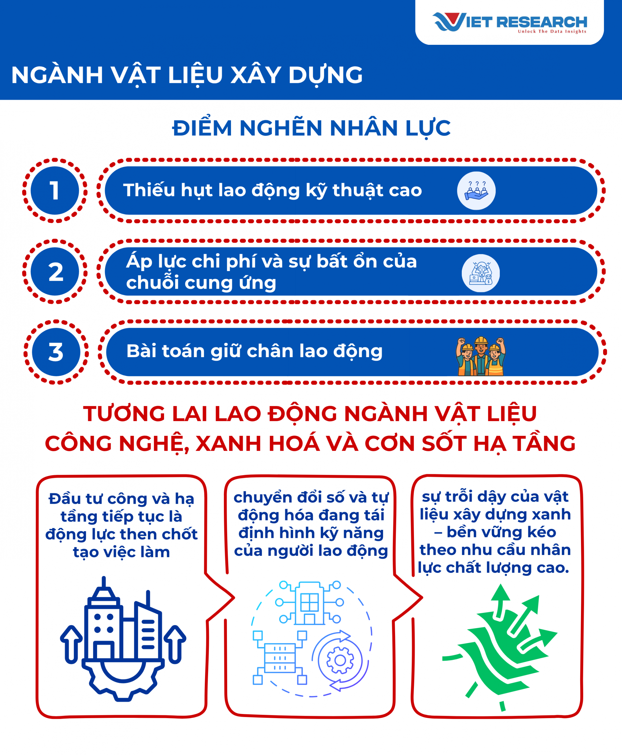 Nhìn tổng thể, thị trường lao động ngành VLXD đang bước vào giai đoạn mở rộng mạnh mẽ cả về quy mô và cường độ việc làm. Các công trình trọng điểm – cao tốc, sân bay, khu công nghiệp, đô thị mới và nhà ở xã hội – được thúc đẩy trong giai đoạn 2023–2025 đang tạo ra lực hút lớn về nhân công. Đây là tín hiệu tích cực cho thị trường việc làm trong trung hạn, đồng thời đặt ra yêu cầu cấp thiết về nâng cao chất lượng lao động, chuẩn hóa kỹ năng và cải thiện điều kiện làm việc để đáp ứng tốc độ phát triển mới của ngành.