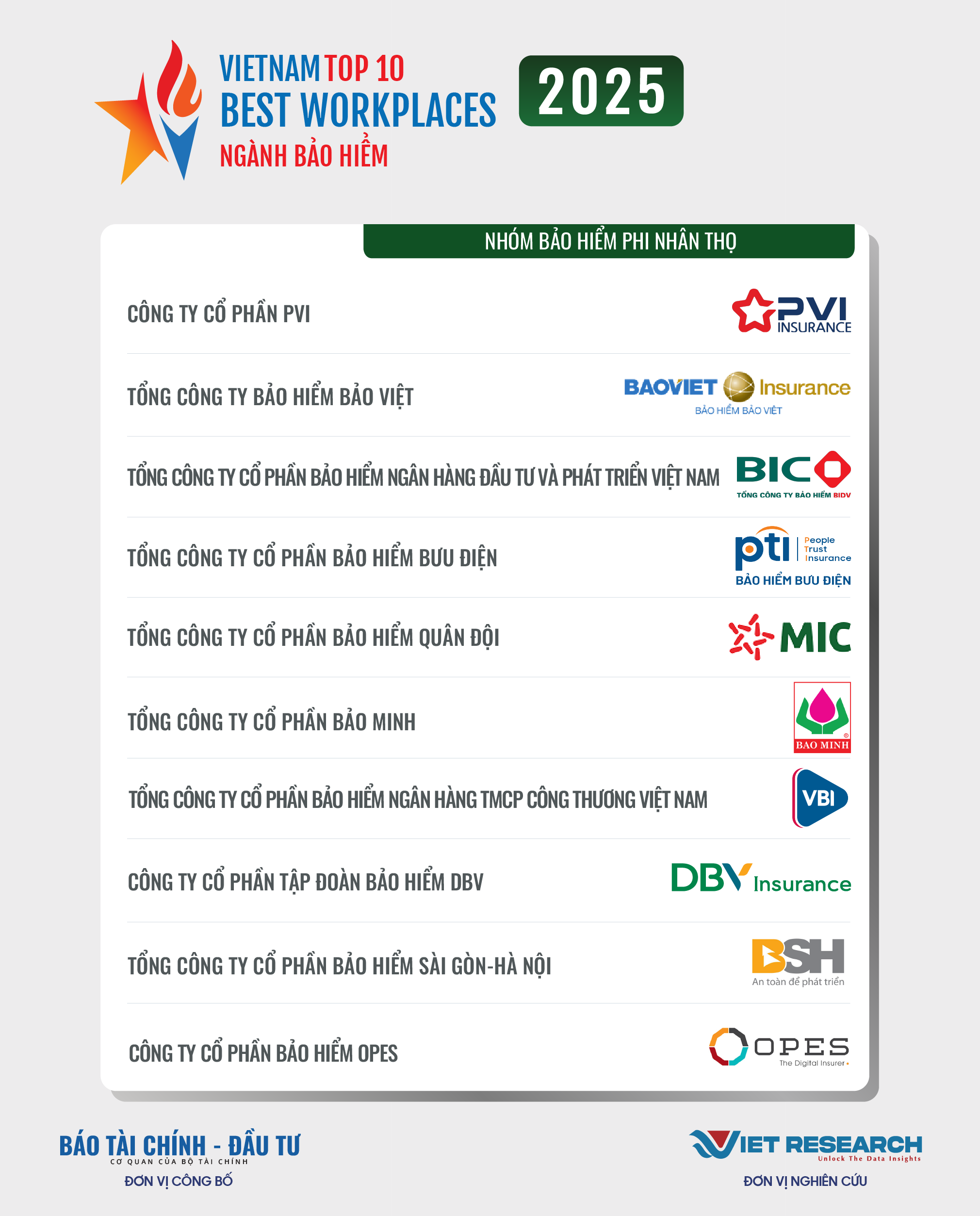 Năm 2025 là năm thứ tư liên tiếp Chương trình Top 10 Nơi làm việc tốt nhất Việt Nam – VBW10 trong các ngành kinh tế trọng điểm được Viet Research và Báo Tài chính – Đầu tư (Bộ Tài chính) nghiên cứu và công bố. Đây là chương trình thường niên nhằm tìm kiếm và tôn vinh những doanh nghiệp có môi trường làm việc tốt nhất trong các ngành, các doanh nghiệp tuyển dụng hàng đầu Việt Nam, những thành tố quan trọng tạo cơ hội việc làm, góp phần chung vào sự phát triển bền vững của đất nước và nền kinh tế trong giai đoạn mới. Những doanh nghiệp xuất sắc góp mặt trong VBW10 đóng vai trò quan trọng trong việc định hình và nâng cao chất lượng thị trường lao động quốc gia, đóng vai trò dẫn dắt trong việc thúc đẩy trách nhiệm xã hội và phát triển bền vững, tạo ra giá trị lâu dài cho các cổ đông, người lao động, nền kinh tế và xã hội.